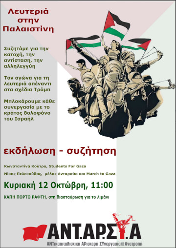 σε εκδήλωση-συζήτηση με αφορμή και τις τελευταίες εξελίξεις για το Παλαιστινιακό ζήτημα, τον αγώνα της Παλαιστινιακής Αντίστασης και το σχέδιο ΗΠΑ Τραμπ, το ρόλο της κυβέρνησης και των ΗΠΑ -ΕΕ, την εμπειρία από τις πρόσφατες αποστολές αλληλεγγύης στην Παλαιστίνη και τους αγώνες στην Ελλάδα και διεθνώς.