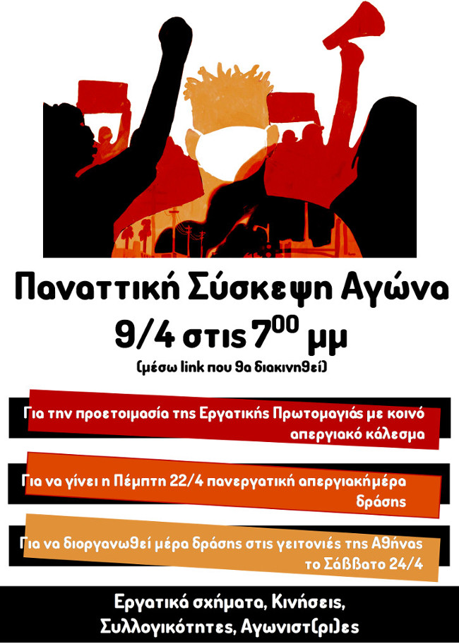 Η εργατική σύσκεψη αγώνα σχημάτων/κινήσεων/συλλογικοτήτων/αγωνιστ(ρι)ών (δείτε και εδώ) απευθύνει κάλεσμα σε όλους όσους συνέβαλαν στο να βγουν ο λαός και η νεολαία στο δρόμο το τελευταίο διάστημα, να σπάσουν τη βιτρίνα της κυβερνητικής νομιμοποίησης και να καταδικάσουν την πολιτική της, δολοφονική όσον αφορά την διαχείριση της πανδημίας, που ρίχνει στη φτώχεια ολοένα και περισσότερους και περισσότερες στο οικονομικό της σκέλος, και βάναυσα αντιδημοκρατική στο πεδίο των δικαιωμάτων.