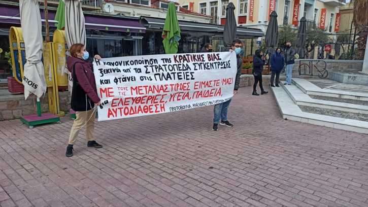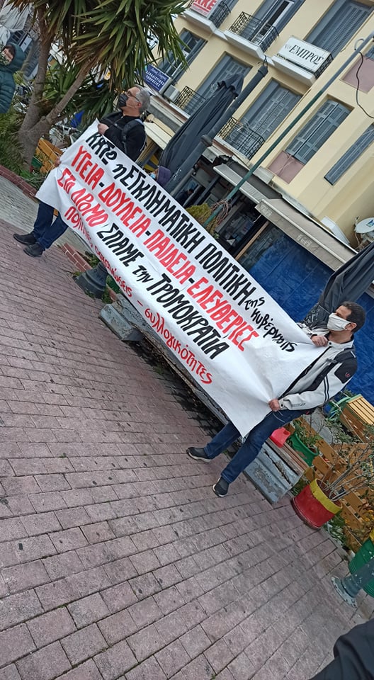 Περίπου 80 κάτοικοι της Μυτιλήνης διαδήλωσαν το απόγευμα της Τρίτης 23/03/2021 στην Πλατεία Σαπφούς την αντίθεση τους στην κρατική τρομοκρατία, παρά τον δυνατό βορειά και τις πολύ χαμηλές θερμοκρασίες που επικρατούσαν στην πρωτεύουσα της Λέσβου. Οι συγκεντρωμένοι διατράνωσαν την αντίθεση τους στο όργιο αστυνομοκρατίας που έχει εξαπολύσει η κυβέρνηση προκειμένου να καλύψει την παταγώδη αποτυχία της να αντιμετωπίσει την υγειονομική κρίση. Επίσης φωνάχτηκαν συνθήματα ενάντια στην αντιμεταναστευτική πολιτική της Ε.Ε. και των Ελληνικών κυβερνήσεων που προωθούν την κατασκευή κλειστών στρατοπέδων συγκέντρωσης των προσφύγων σε όλες τις συνοριακές περιοχές της Ε.Ε. με τρίτες χώρες, την ενίσχυση της Frontex και όλων των μέτρων καταστολής που ήδη χρησιμοποιούνται σε βάρος των προσφύγων.