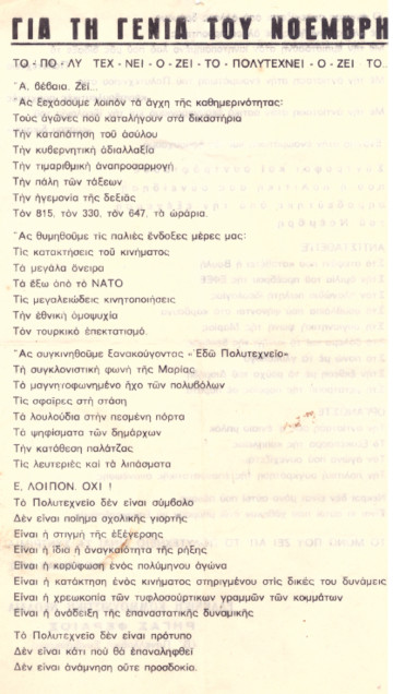 Κάποιες αξίες της Β’ Π συνέχισαν να ζουν, μέσα και από τα θραύσματα των δυνάμεών της. Παραφράζω εδώ ένα μνημείο της ιστορίας αυτής, την προκήρυξη των καταλήψεων του ’79, που αν και αναφέρεται στην επέτειο του Νοέμβρη, διατηρεί ευρύτερη και βαθύτερη επικαιρότητα.