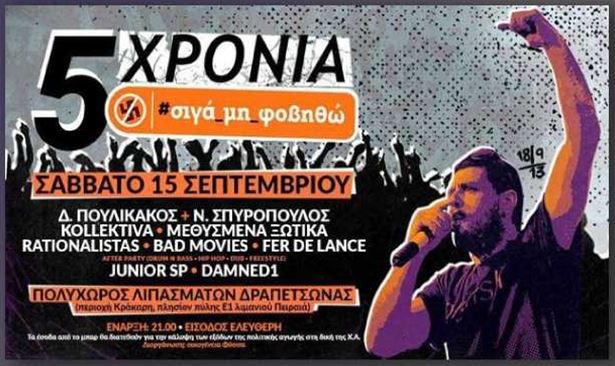 «Καλούμε όποιον νιώθει την ευθύνη να σταθεί μαζί μας και απέναντί τους»: η οικογένεια και οι φίλοι του, πέντε χρόνια από εκείνη τη νύχτα που «ο Παύλος στάθηκε όρθιος και κοίταξε “το Τέρας” στα μάτια», όπως γράφουν, καλούν το Σάββατο στη συναυλία στον νέο χώρο των Λιπασμάτων του Δήμου Κερατσινίου – Δραπετσώνας και την Τρίτη στην αντιφασιστική πορεία από το Κερατσίνι προς τα γραφεία των νεοναζί στον Πειραιά.