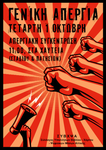 Αφίσα του Συλλόγου Υπαλλήλων Βιβλίου – Χάρτου – Ψηφιακών Μέσων Αττικής (ΣΥΒΧΨΑ) για την πανεργατική απεργία της 1ης Οκτωβρίου 2025.
