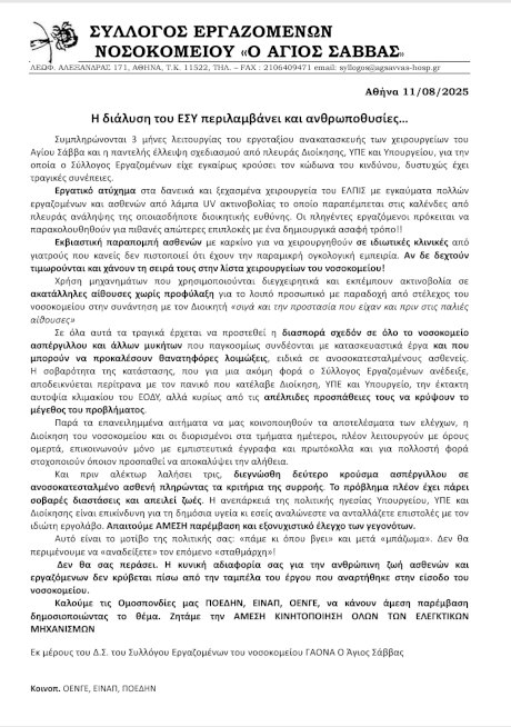 Και όλα αυτά διότι ο Σύλλογος Εργαζομένων ΓΑΟΝΑ «Άγιος Σάββας» για δεύτερη φορά τους τελευταίους δυο μήνες επεσήμανε ανησυχητικά επικίνδυνη διασπορά του μύκητα ασπέργιλλου στους χώρους του νοσοκομείου που μπορεί να προκαλέσει δευτερογενείς νοσοκομειακές λοιμώξεις μοιραίες για ογκολογικούς ανοσοκατεσταλμένους ασθενείς.