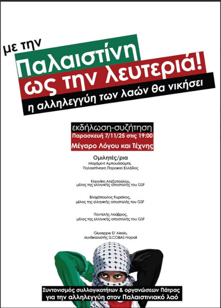 Ο Συντονισμός Συλλογικοτήτων και Οργανώσεων Πάτρας για την Αλληλεγγύη στον Παλαιστινιακό Λαό καλεί σε εκδήλωση –συζήτηση την Παρασκευή 7 Νοέμβρη 2025, στις 19:00, στο Μέγαρο Λόγου και Τέχνης. Στην εκδήλωση θα μιλήσουν μέλη της Παλαιστινιακής Παροικίας Ελλάδας, μέλη της ελληνικής αποστολής του Global Sumud Flotilla ενώ θα υπάρξει και συμμετοχή συνδικαλιστική από την Ιταλία, μεταφέροντας το κλίμα των μεγαλειωδών απεργιών αλληλεγγύης στον Παλαιστινιακό λαό.