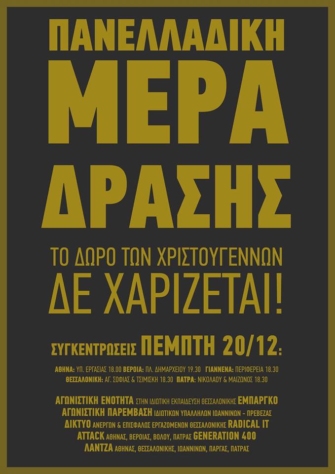 Καμπάνια για την καθολική καταβολή του δώρου Χριστουγέννων, το οποίο κάθε χρόνο τέτοιο καιρό αρκετοί εργοδότες επιχειρούν παράνομα να μην δώσουν στους εργαζόμενους με διάφορους τρόπους, έχουν προχωρήσει μια σειρά εργατικά σχήματα και συλλογικότητες.