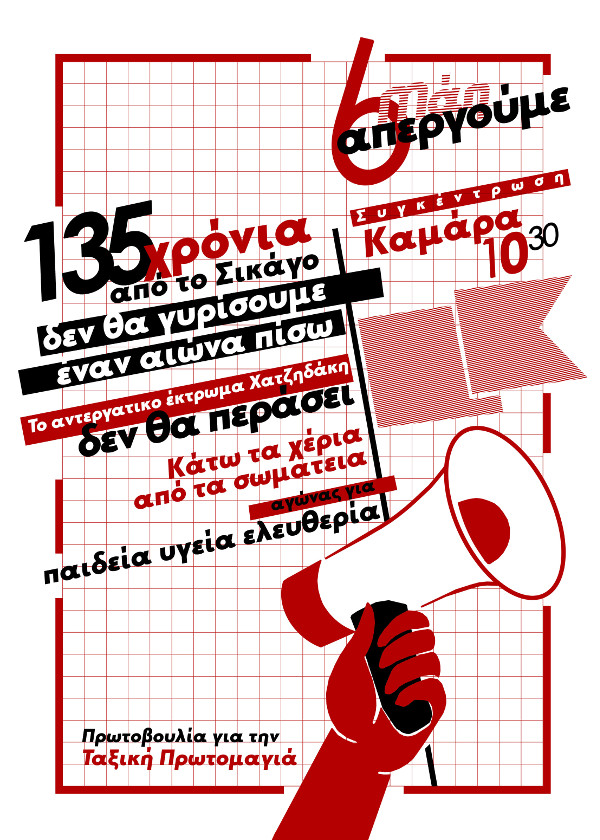 Οι εργαζόμενοι, και τα σωματεία παίρνουμε στα χέρια μας την υπόθεση του απεργιακού εορτασμού της Πρωτομαγιάς. Την Πέμπτη 6 Μάη προτείνουμε και παλεύουμε για την προκήρυξη απεργίας με ταξική απεργιακή συγκέντρωση και πορεία. Παλεύουμε για την ανάπτυξη κινητοποιήσεων και απεργιών ενάντια στα σχέδια της κυβέρνησης και του ΣΕΒ, για να μην κατατεθεί το αντεργατικό τερατούργημα.