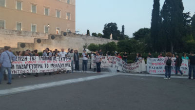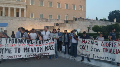Το πανό του Συντονιστικού των Αναπληρωτών και Αδιόριστων έγραφε: «Υπάκουοι Αναπληρωτές, Δούλοι, ΤΕΛΟΣ! Σπάμε τα δεσμά της ανεργίας και της ελαστικής εργασίας.»