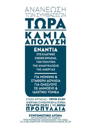 Την Κυριακή 19/01 στις 11.00 Ερμού με Φιλελλήνων, καλούμε όλους τους συμβασιούχους που είτε δουλεύουν με κάποιο πρόγραμμα, είτε με συμβάσεις ορισμένου χρόνου και βιώνουν τη συνεχή εργασιακή ανασφάλεια, σε κοινή κινητοποίηση ενάντια στις ελαστικές σχέσεις εργασίας, τις απολύσεις, για μόνιμη και σταθερή δουλειά για όλες/ους. Την ίδια μέρα θα πραγματοποιηθεί απεργιακή συγκέντρωση ενάντια στην κατάργηση της κυριακάτικης αργίας, αγώνας στον οποίο στεκόμαστε αλληλέγγυες/οι.