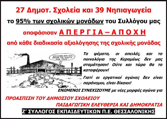 Οι εκπαιδευτικοί μέσα από τα Σωματεία και τις Ομοσπονδίες μας θα συνεχίσουμε ενωμένοι και με νέα όπλα τον αγώνα ανασχετικούς φραγμούς να στήσουμε στην αξιολογική λαίλαπα, την ανατροπή αυτής της πολιτικής να οργανώσουμε!